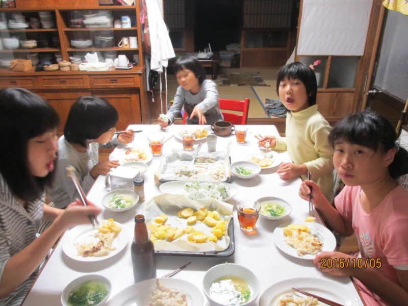 山村留学生の2人を入れて、5人娘でにぎわう福岡家の食卓