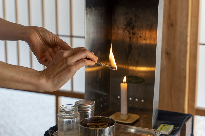 テルミー線という数種類の薬草でできたお線香のようなものなのですが、それを冷温器の内管に差し込んで火をつけて、カバーになる外管を被せます。2本を一緒に持って、熱くなりすぎないよう、そして血液やリンパ液の流れが促進されるように、直接肌に当てながら動かします。